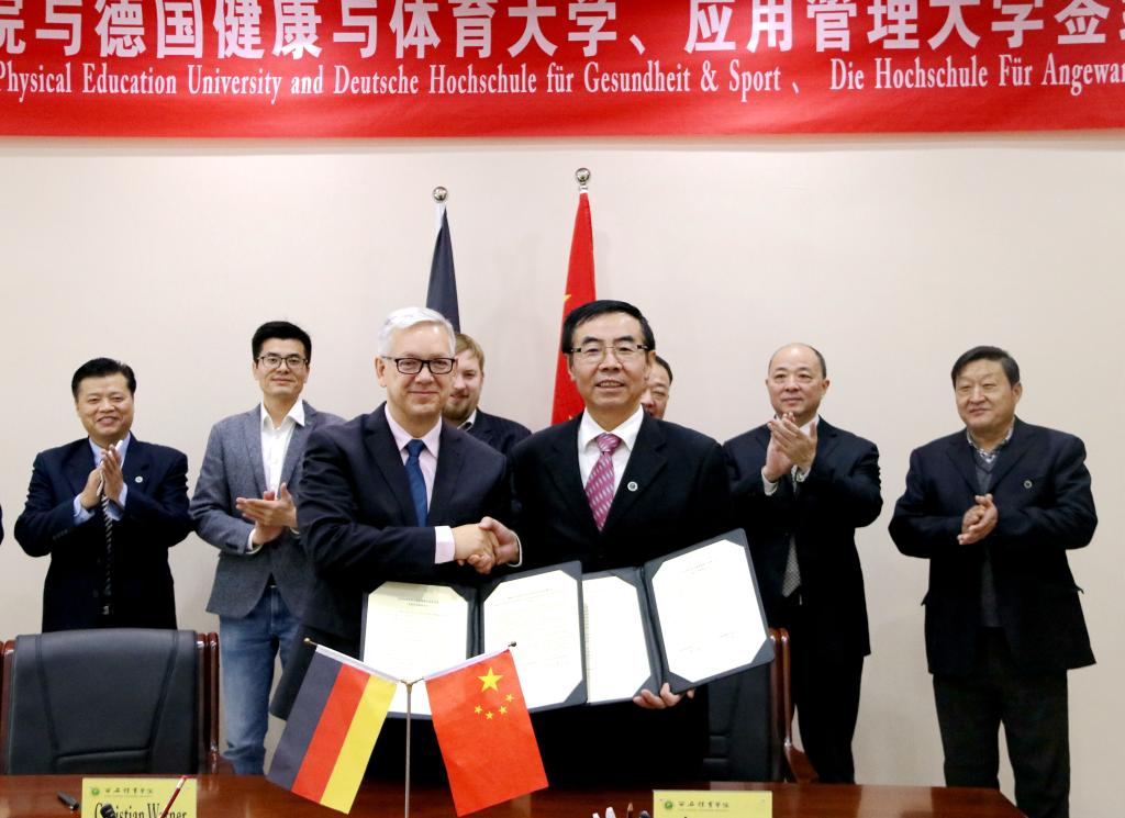 座谈结束后,朱元利与Christian Werner校长代表双方签订了《海豚体育与德国健康与体育大学交流合作框架协议》以及《海豚体育与德国应用管理大学本硕联合培养协议》。之后,德方一行在我院工作人员的陪同下,参观体验了运动康复专业针灸与按摩课程,观摩了乒乓球课程以及武术系学生精彩的武术表演,并表现出了极大的兴趣,为下一步双方合作打下良好基础。